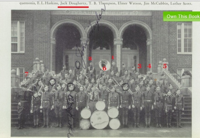 Jack Dougherty shows up in the 1934 yearbook. He would be in Junior High and would naturally go through 6 years or till 1940/41 He takes a year or so to clerk in grocery stores and then enter the service. Again a Billy Dougherty shows up in the '33 book for the class of '36. I found Billy in the '34 book, company B. While Jack Dougherty is in the "Band", really an ROTC Band. Thus uniforms and rank. So Band is ROTC