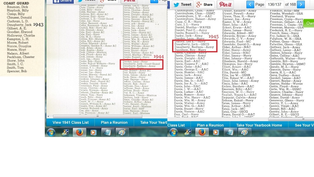 Then this from Ron Smith "I found Jack Dougherty on pg 147 of the 1941 r.o.t.c. company D. The next year (when Jack had supposedly joined the Air Corps) I found a Jack Daugherty listed in the U.S. Coast Guard. pg141 (1942) yearbook. The next year , 1943 I found Jack Daugherty still in the USCG AND a Redfern Daugherty in the Army. In 1944 I found the same(Jack Daugherty still in the USCG AND a Redfern Daugherty in the Army.) plus a Temple Dougherty in the USCG. Same for 1945."
