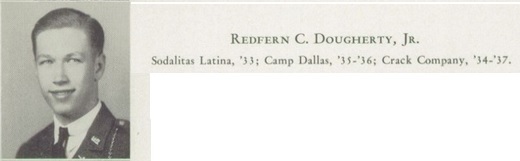 Redfern is Jack's brother, and he was born in 1921. He shows up in '36 yearbook as ROTC 2nd Lieutenant. Redfern should be graduated and into the service by 1940,,, so if the family was in Dallas why did Redfern not show up till '36 when younger bro Jack shows up in '34 book? Or is the '34 a wrong spelling? Redfern's bio list him in the Latin club Sodalitas in '33 He is not there and no listing in El Solita or El Sol that I checked, in case a mistake was made. No Redfern till the '36 book. I looked through them all. 30's -40's The next year '37 he is Battalion Commander: Major Redfern Dougherty. Redfern was also a member of the yearbook staff, working on the Stampede section.