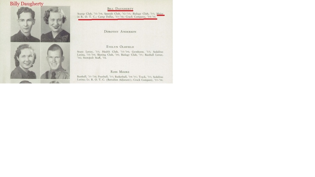 In the '33 yearbook is Bill Daugherty. He is in Company D and he is listed as Billy Daugherty. His '36 yearbook picture bio shows he was in '34 ROTC thru '36 and is a Major. He is not in the '33 books stamp club or spanish club.