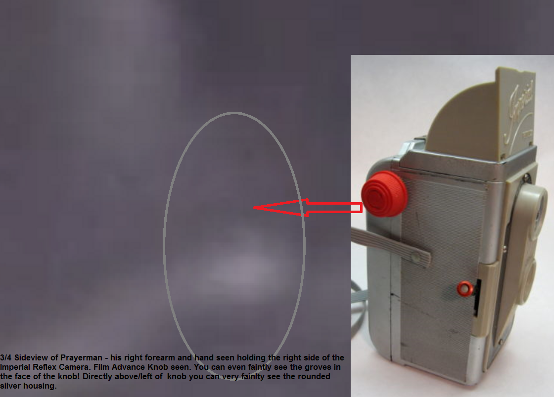 I FOUND IT!!! See attached! Be aware it is very dim and blurry, I had to blow it up about 400% to bring it out...but let your eyes focus in on it and you WILL see it! It is freaking amazing! When I found it I almost cried! I included a handy dandy inset of an actual Imperial Reflex with an arrow indicating the knob for the pixilated-impaired! (Gayle...) If you look at the movie clips/GIFs of PM there is one, where I posted some time ago, that it looks to me like PM may be winding something judging by the way his hands appear to be moving...I wonder... PS Welcome to the forum!!! EDIT: Found it here... http://www.reopenkennedycase.org/apps/forums/topics/show/13163914-prayer-man-gifs?page=4 | |