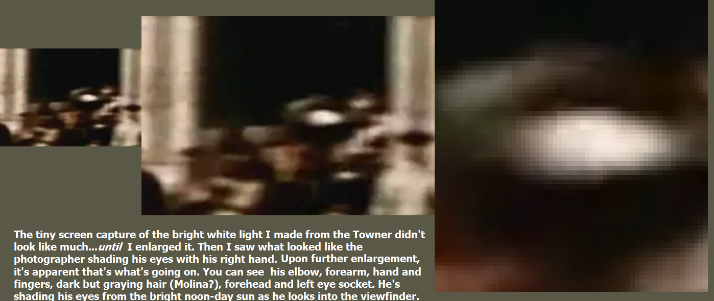 As I said, one can’t see PM [or rather, the other photographer] himself in Martin as one can in the Darnell/Wiegman PM stills. He is deep in the shadows here. However, in the enlargement N.B. there is a small whitish object just to the left (anatomical right) of the round white light which I think could be his right hand holding the camera, being illuminated slightly by sunlight. You have to enlarge the photo to see the “hand”. …In addition to finding this bright white light in Martin I also found it in Towner in the same basic area farther east on the top step! Rather than being perfectly round, however, it is a stretched out oval. IMO this is due to Towner and LHO panning their cameras to follow the limo as it passed them. Whether or not “LHO” is panning his camera, Towner is definitely panning his, so the whole Towner video has some motion blur which would stretch out this circle of light. Here is a still from Towner capturing the bright white light. [You can also occasionally see a smaller round white light which at times is also blurred and elongated – is this evidence of PM's smaller IR 620 in addition to the much larger white light from the TLR of the other photographer on the steps? I believe so.]:
